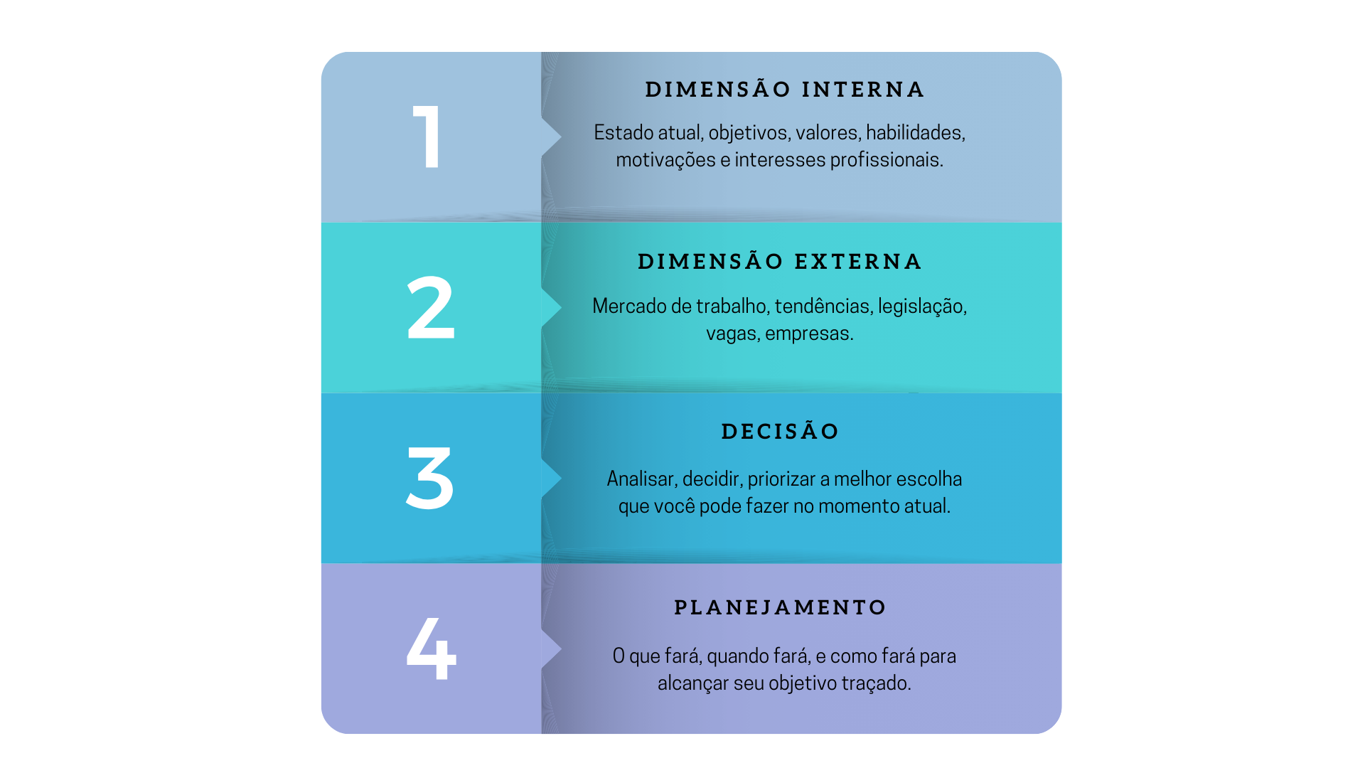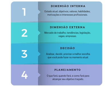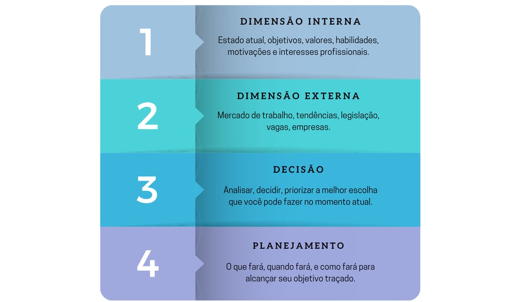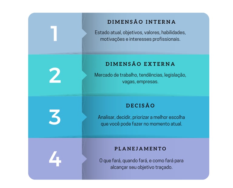 Durante o processo de Orientação de Carreira, você irá percorrer quatro áreas importantes para conseguir fazer a melhor escolha possível para sua carreira, em seu atual momento de vida.